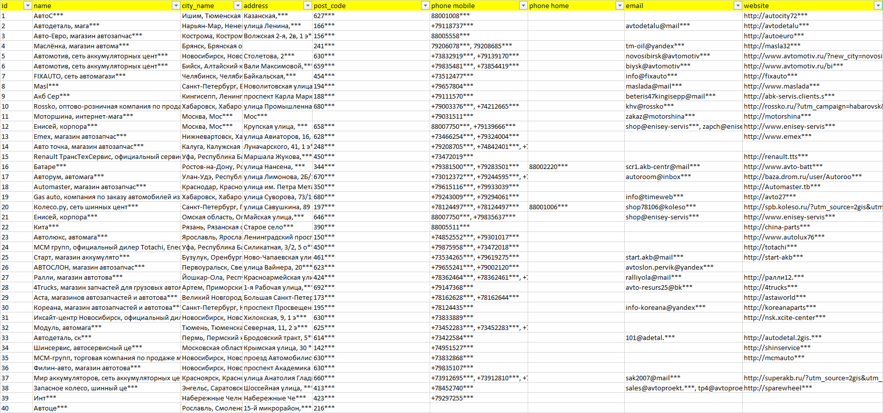 База компаний автомобильные аккумуляторы, вся РФ в формате Excel с эл. почтами, телефонами, сайтами, ссылками на соц сети, координатами и другой информацией. Скачайте демо версию, чтобы ознакомиться с данными.