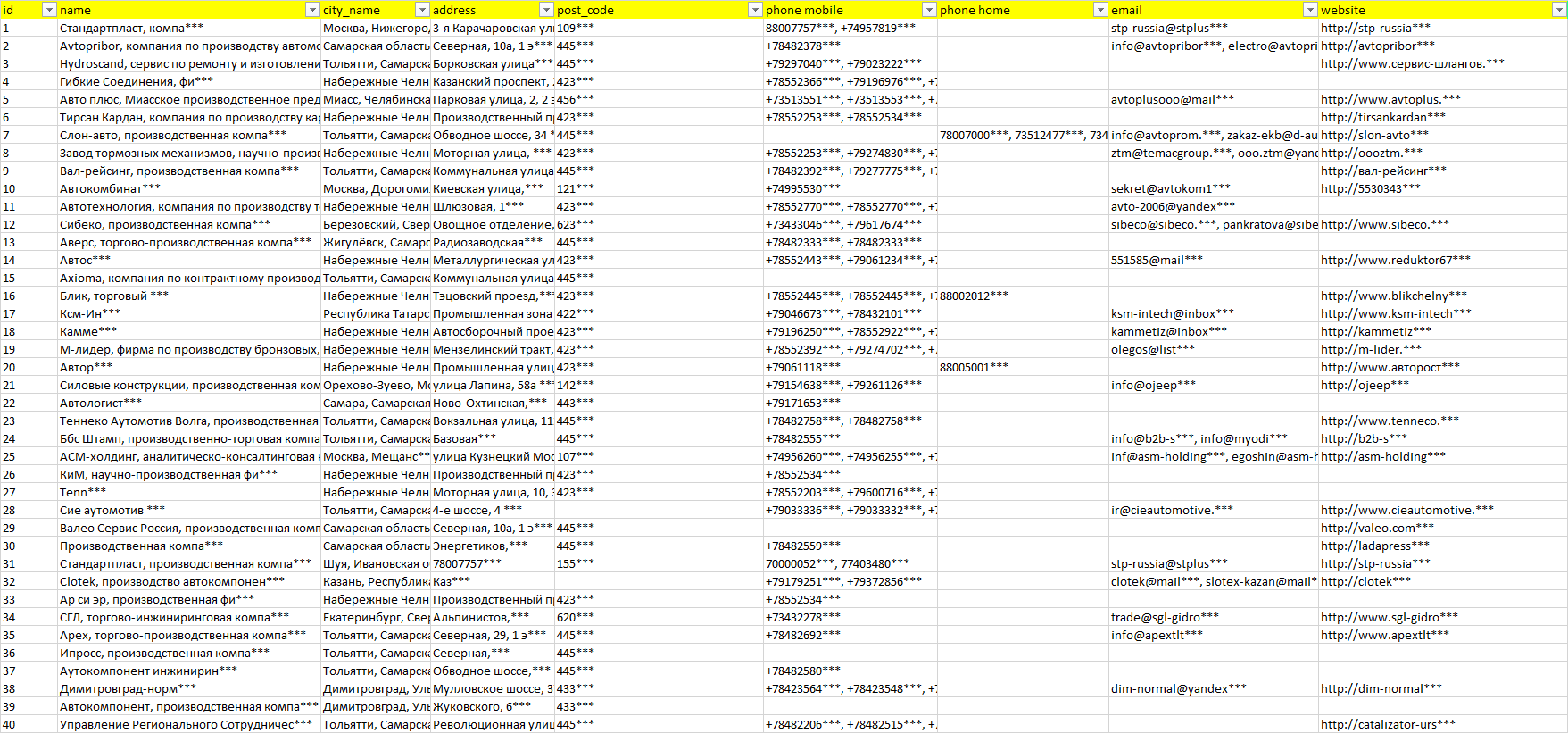 База организаций производство автокомплектующих, вся Россия в формате Excel с эл. почтами, телефонами, сайтами, ссылками на соц сети, координатами и другой информацией. Скачайте демо версию, чтобы ознакомиться с данными.