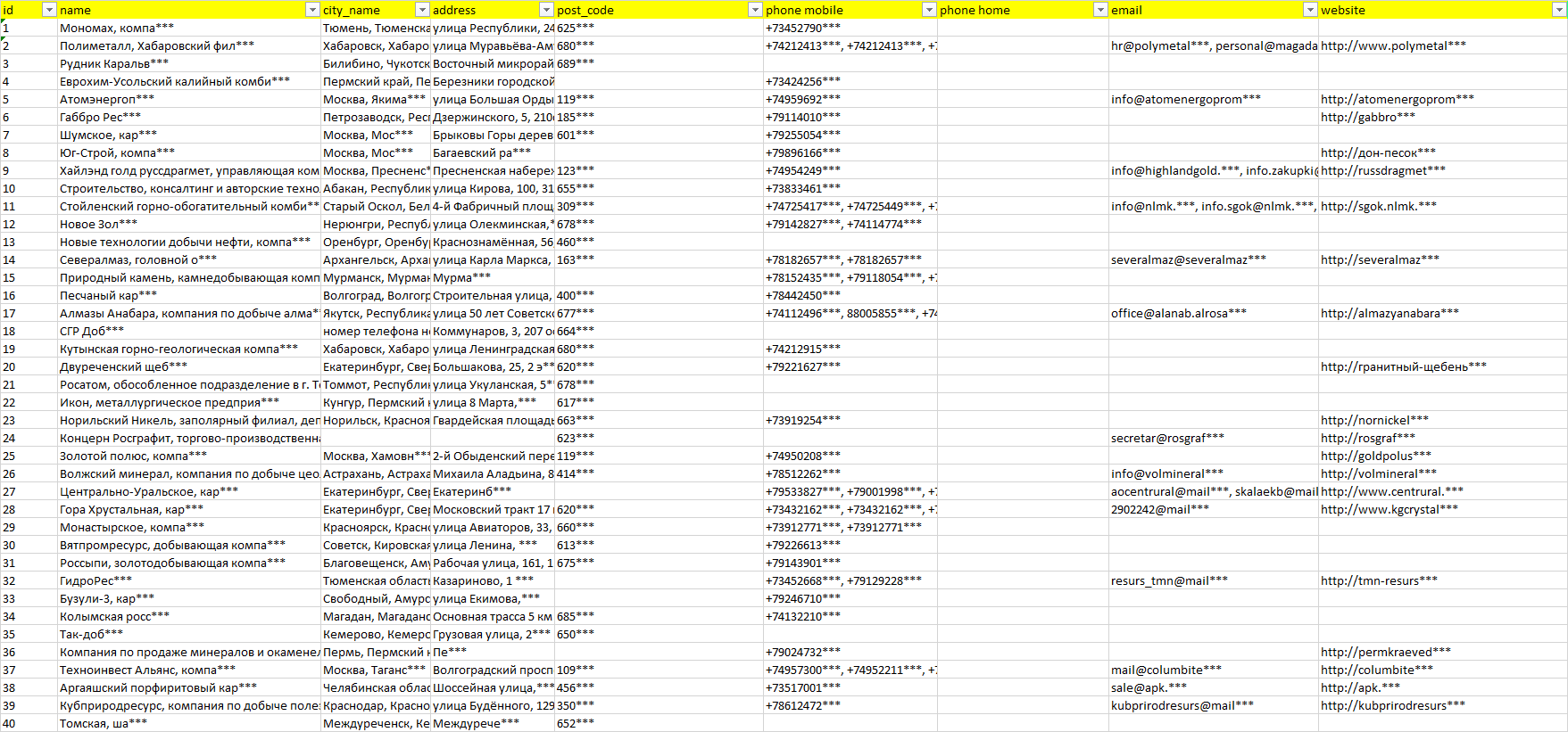 База организаций добыча полезных ископаемых, вся Россия в формате Excel с эл. почтами, телефонами, сайтами, ссылками на соц сети, координатами и другой информацией. Скачайте демо версию, чтобы ознакомиться с данными.