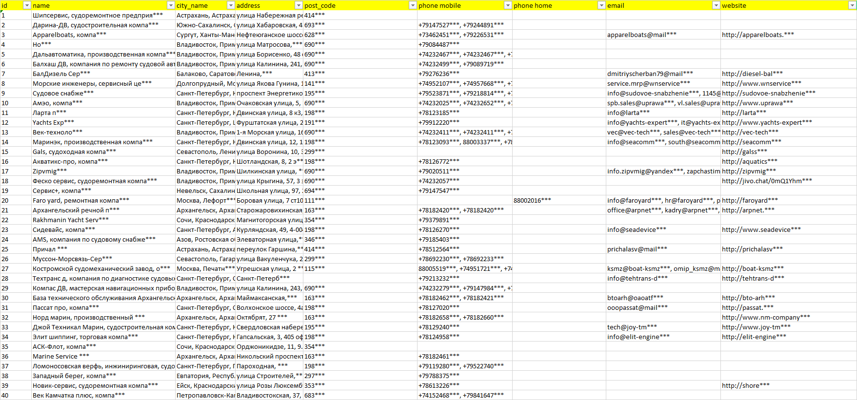База компаний обслуживание судового оборудования, вся РФ в формате Excel с эл. почтами, телефонами, сайтами, ссылками на соц сети, координатами и другой информацией. Скачайте демо версию, чтобы ознакомиться с данными.