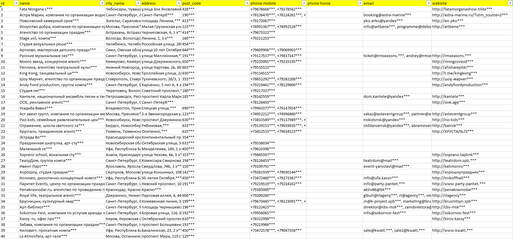 База организаций театральные концертные мероприятия, вся Россия в формате Excel с эл. почтами, телефонами, сайтами, ссылками на соц сети, координатами и другой информацией. Скачайте демо версию, чтобы ознакомиться с данными.