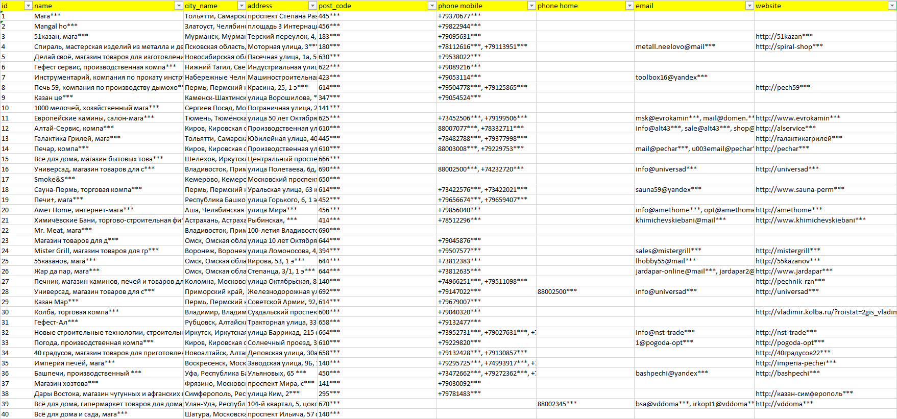 База организаций мангалы коптильни тандыры, вся Россия в формате Excel с эл. почтами, телефонами, сайтами, ссылками на соц сети, координатами и другой информацией. Скачайте демо версию, чтобы ознакомиться с данными.