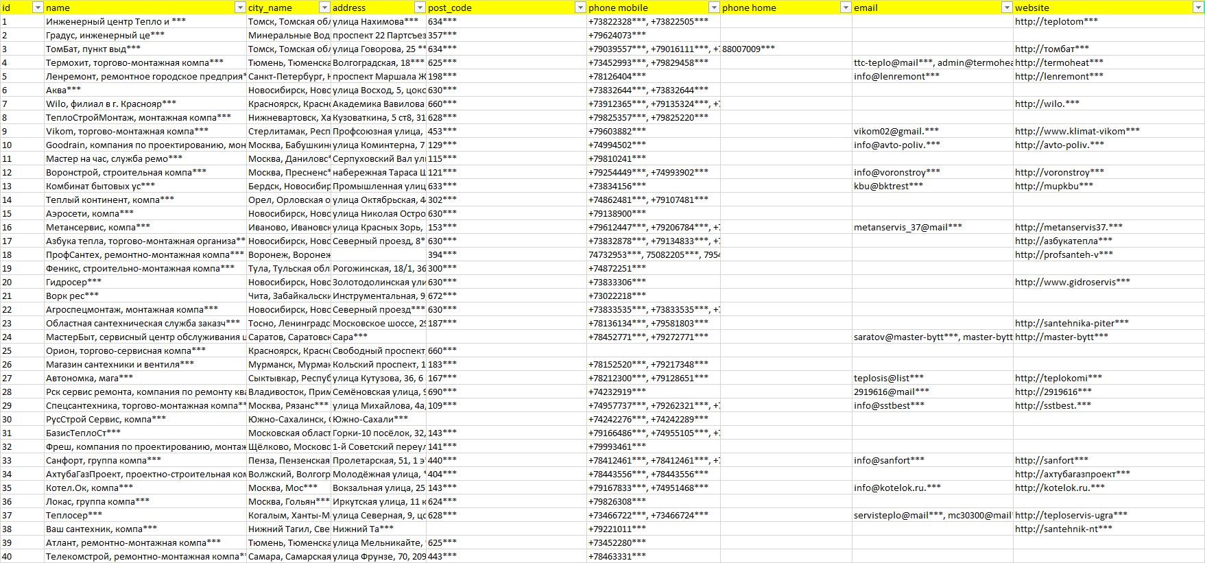 База компаний внутренние системы отопления водоснабжения канализации, вся РФ в формате Excel с эл. почтами, телефонами, сайтами, ссылками на соц сети, координатами и другой информацией. Скачайте демо версию, чтобы ознакомиться с данными.