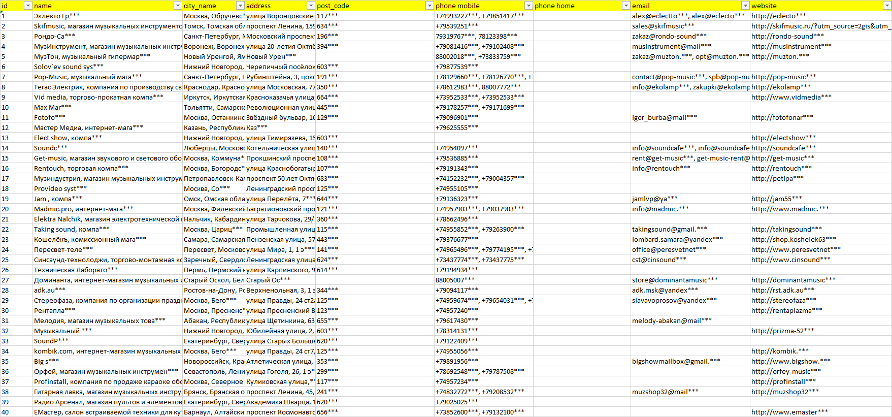 База организаций звуковое световое и видеооборудование, вся Россия в формате Excel с эл. почтами, телефонами, сайтами, ссылками на соц сети, координатами и другой информацией. Скачайте демо версию, чтобы ознакомиться с данными.