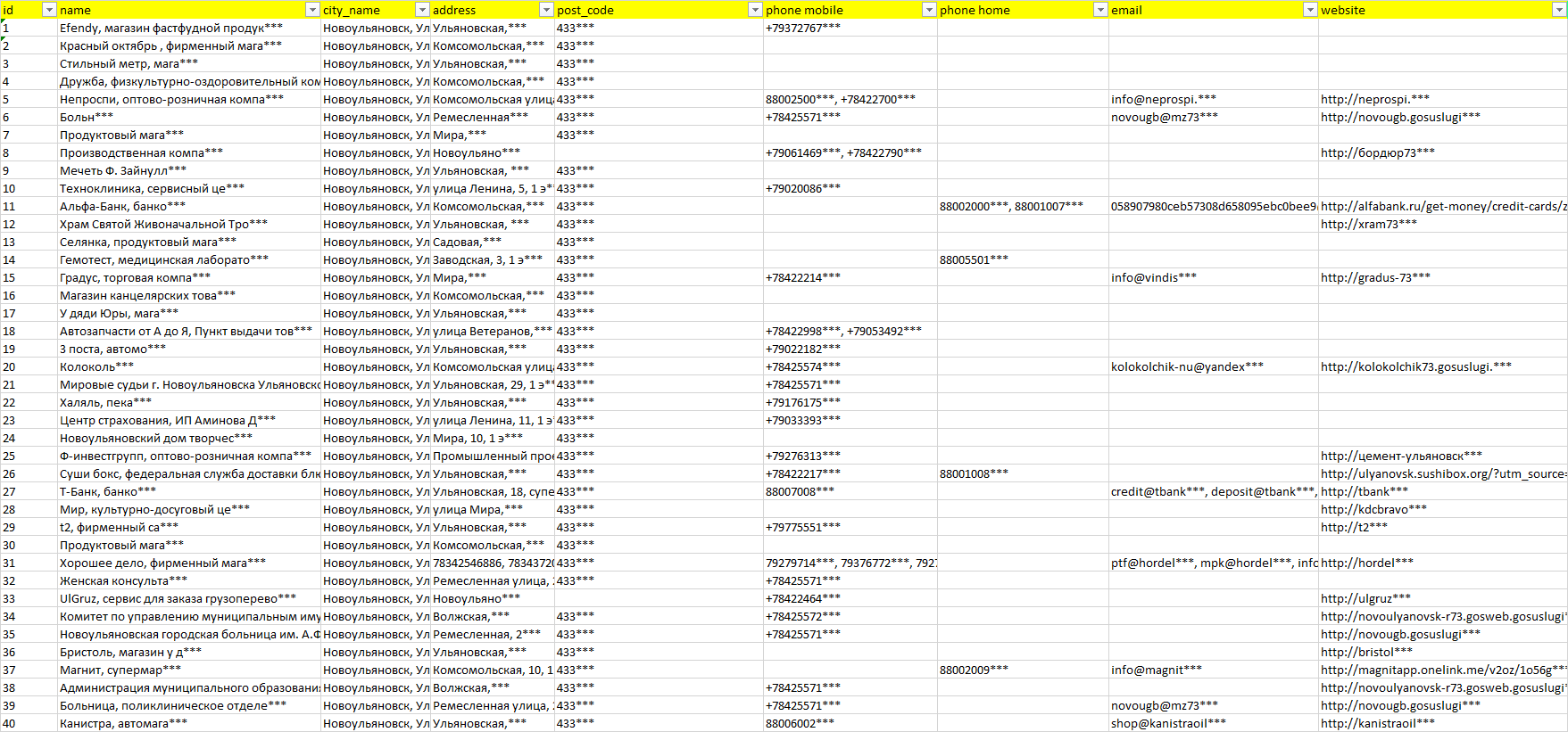 База организаций Новоульяновск, вся Россия в формате Excel с эл. почтами, телефонами, сайтами, ссылками на соц сети, координатами и другой информацией. Скачайте демо версию, чтобы ознакомиться с данными.