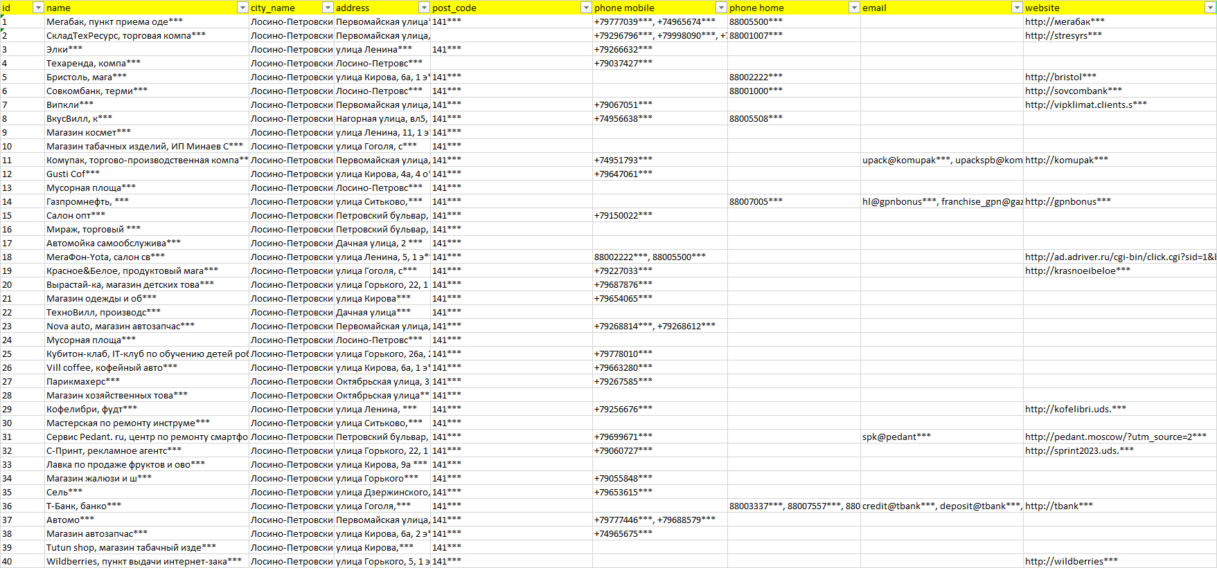 База организаций Лосино-Петровский, вся Россия в формате Excel с эл. почтами, телефонами, сайтами, ссылками на соц сети, координатами и другой информацией. Скачайте демо версию, чтобы ознакомиться с данными.