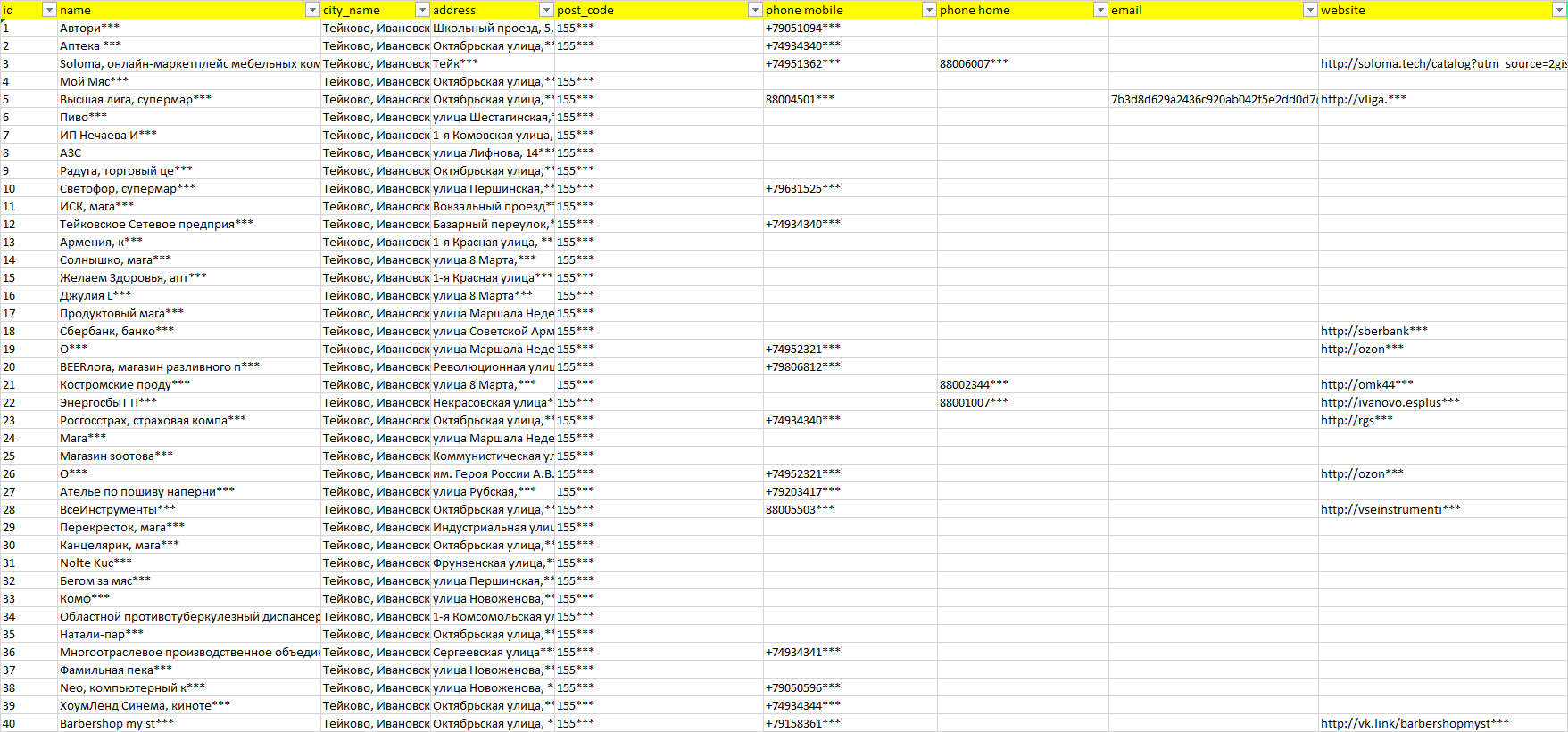 База компаний Тейково, вся РФ в формате Excel с эл. почтами, телефонами, сайтами, ссылками на соц сети, координатами и другой информацией. Скачайте демо версию, чтобы ознакомиться с данными.