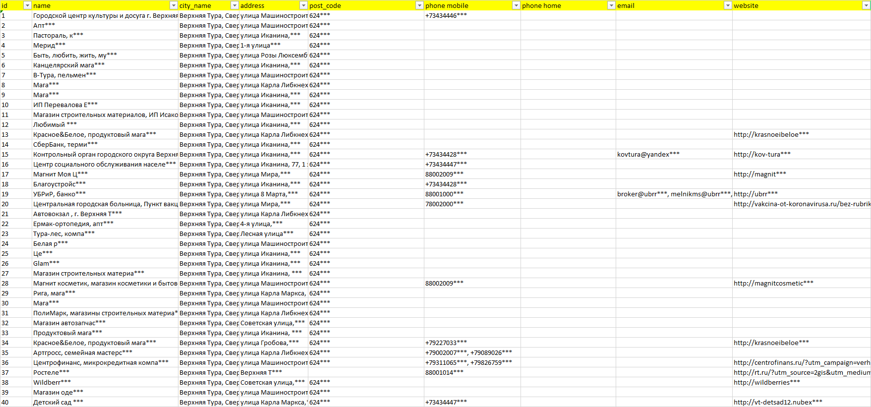 База организаций Верхняя Тура, вся Россия в формате Excel с эл. почтами, телефонами, сайтами, ссылками на соц сети, координатами и другой информацией. Скачайте демо версию, чтобы ознакомиться с данными.