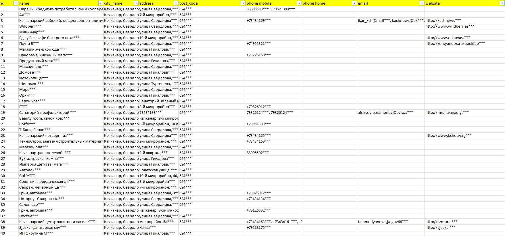 База компаний Качканар, вся РФ в формате Excel с эл. почтами, телефонами, сайтами, ссылками на соц сети, координатами и другой информацией. Скачайте демо версию, чтобы ознакомиться с данными.