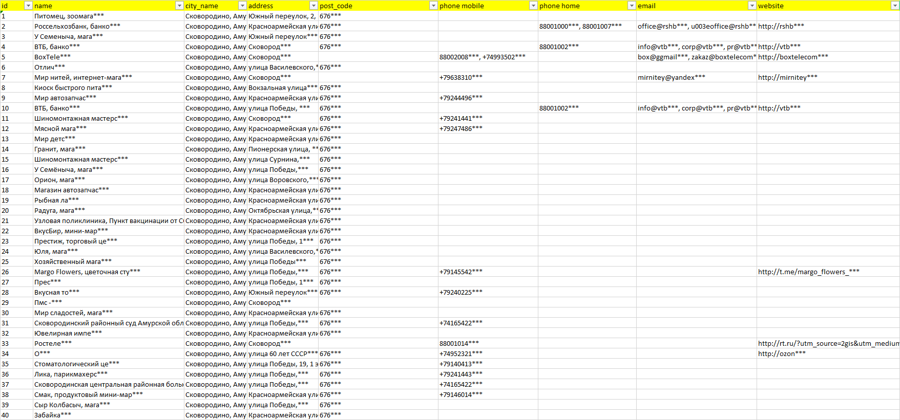 База компаний Сковородино, вся РФ в формате Excel с эл. почтами, телефонами, сайтами, ссылками на соц сети, координатами и другой информацией. Скачайте демо версию, чтобы ознакомиться с данными.
