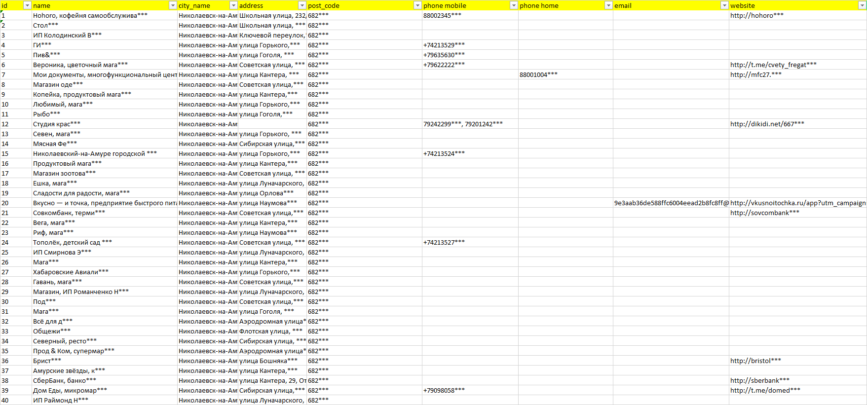 База организаций Николаевск-на-Амуре, вся Россия в формате Excel с эл. почтами, телефонами, сайтами, ссылками на соц сети, координатами и другой информацией. Скачайте демо версию, чтобы ознакомиться с данными.