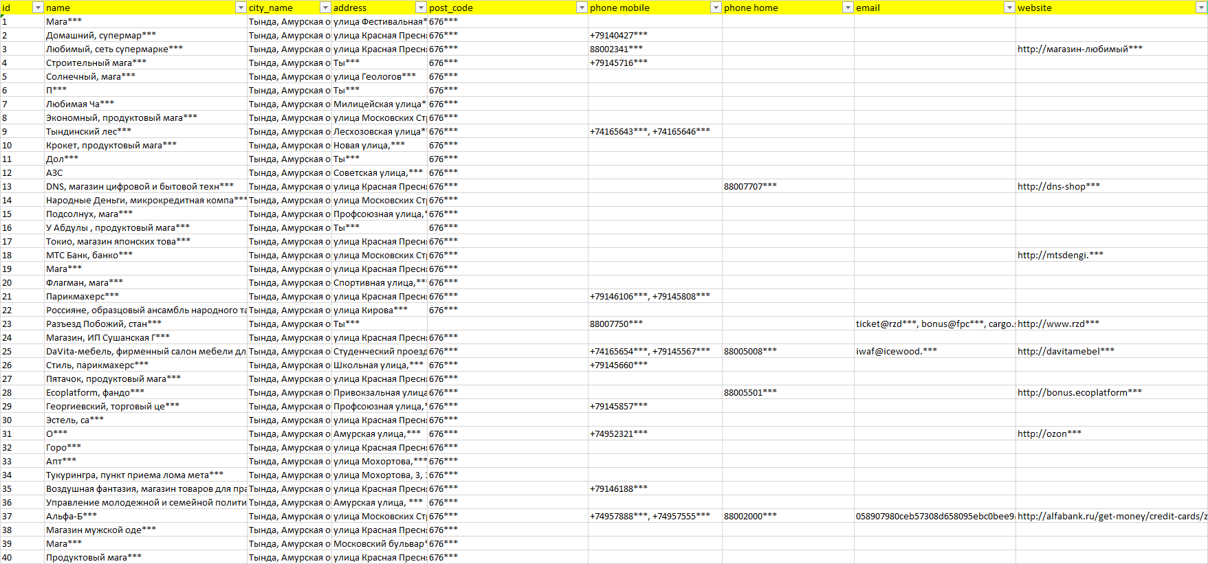 База компаний Тында, вся РФ в формате Excel с эл. почтами, телефонами, сайтами, ссылками на соц сети, координатами и другой информацией. Скачайте демо версию, чтобы ознакомиться с данными.