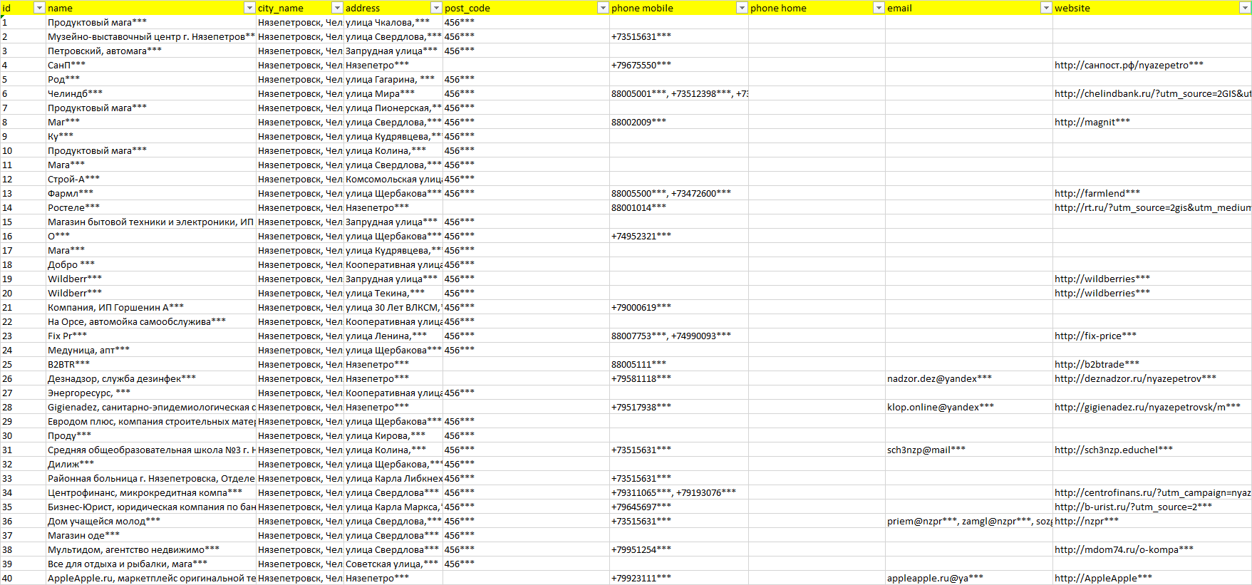 База организаций Нязепетровск, вся Россия в формате Excel с эл. почтами, телефонами, сайтами, ссылками на соц сети, координатами и другой информацией. Скачайте демо версию, чтобы ознакомиться с данными.