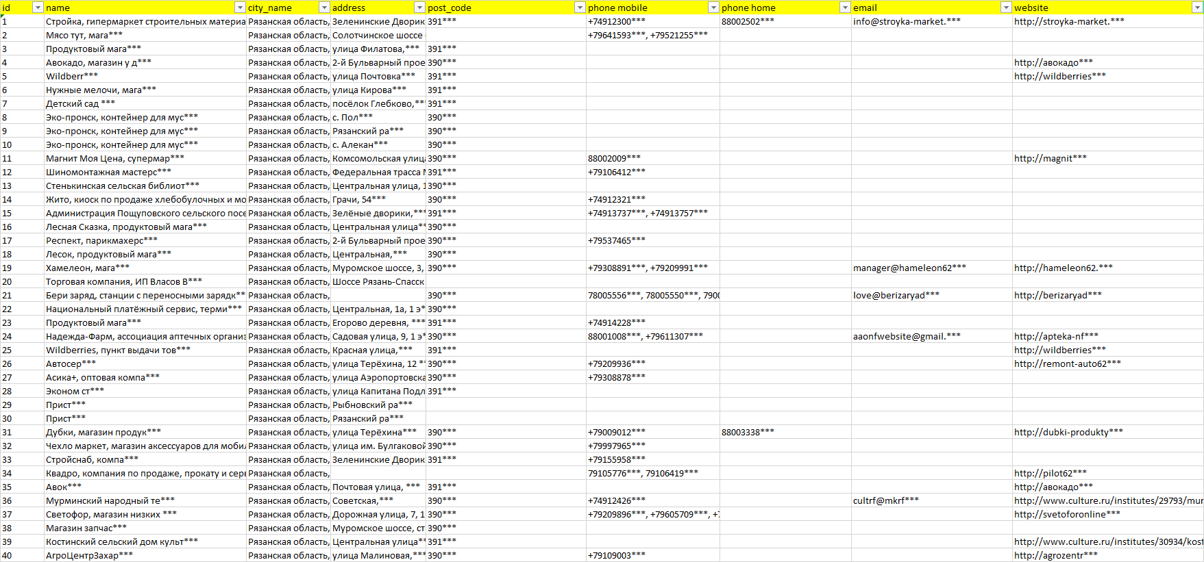 База организаций Рязанская область, вся Россия в формате Excel с эл. почтами, телефонами, сайтами, ссылками на соц сети, координатами и другой информацией. Скачайте демо версию, чтобы ознакомиться с данными.