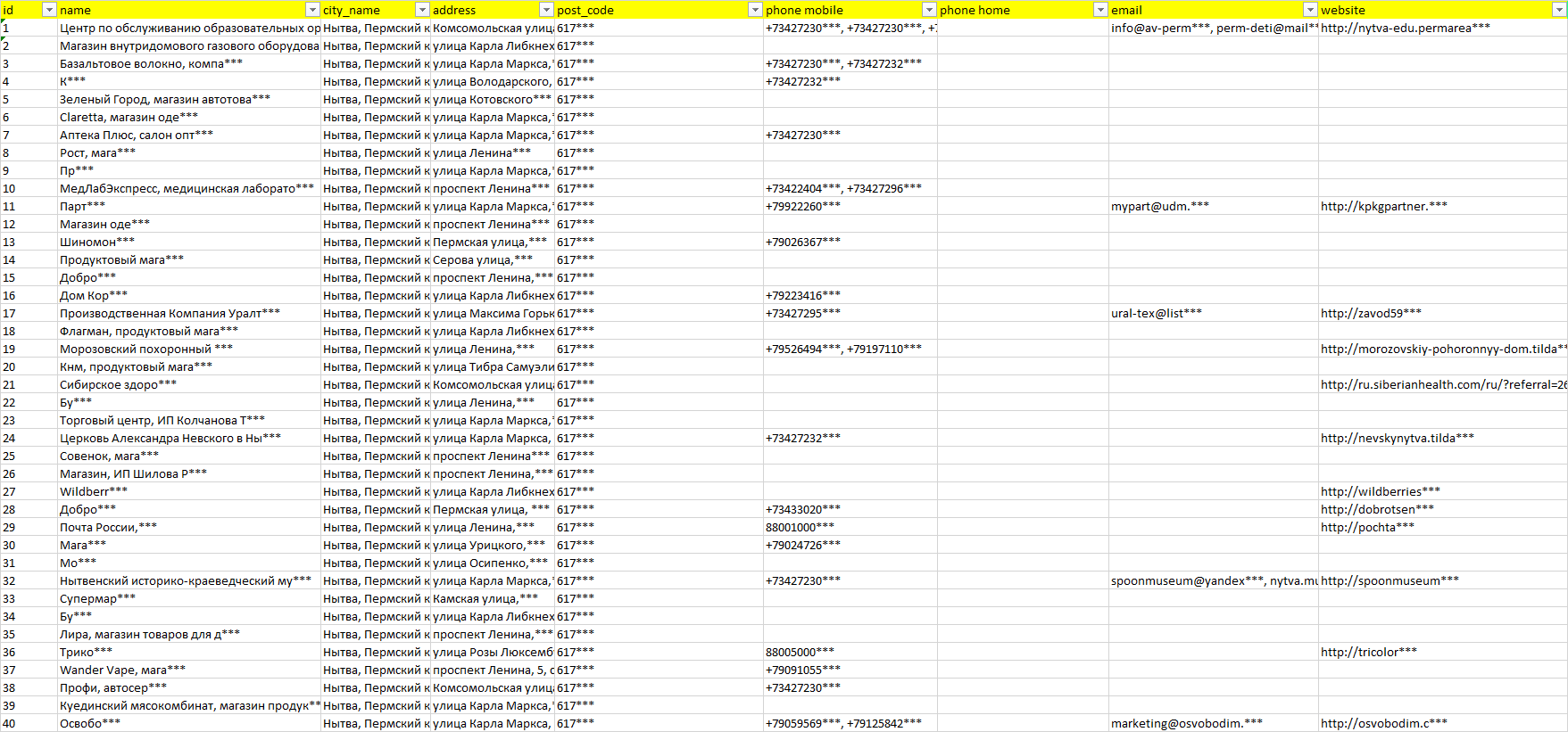 База организаций Нытва, вся Россия в формате Excel с эл. почтами, телефонами, сайтами, ссылками на соц сети, координатами и другой информацией. Скачайте демо версию, чтобы ознакомиться с данными.