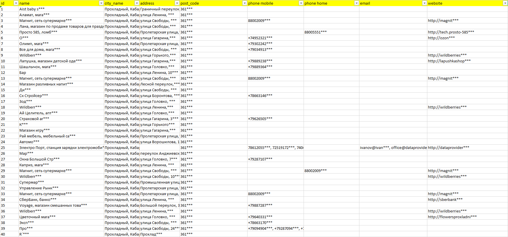 База организаций Прохладный, вся Россия в формате Excel с эл. почтами, телефонами, сайтами, ссылками на соц сети, координатами и другой информацией. Скачайте демо версию, чтобы ознакомиться с данными.