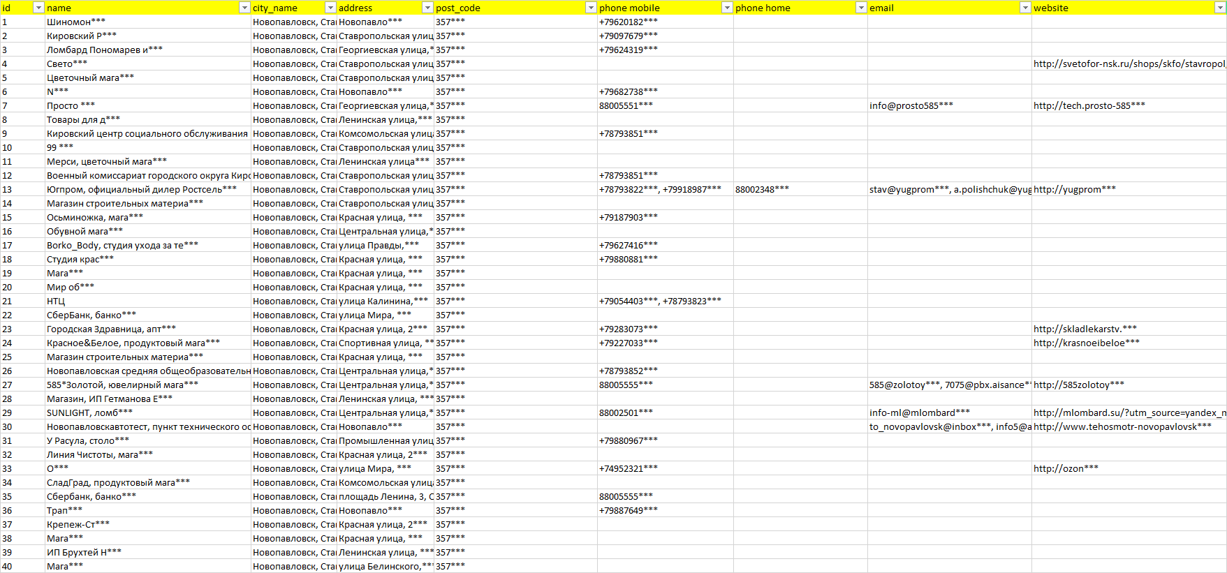 База организаций Новопавловск, вся Россия в формате Excel с эл. почтами, телефонами, сайтами, ссылками на соц сети, координатами и другой информацией. Скачайте демо версию, чтобы ознакомиться с данными.