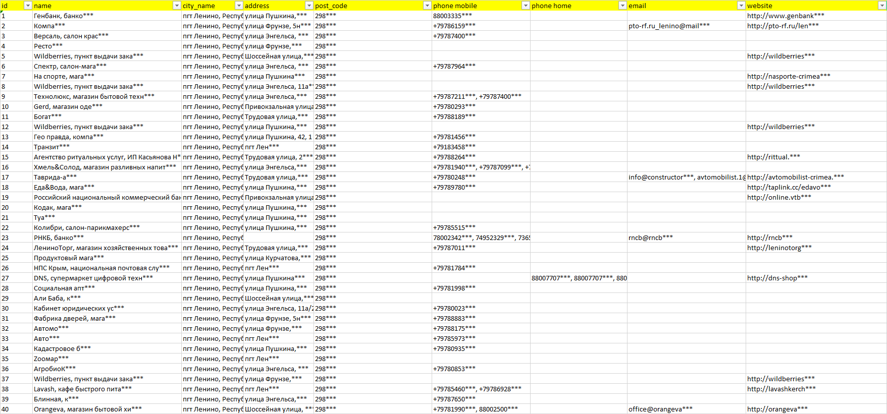 База организаций пгт Ленино, вся Россия в формате Excel с эл. почтами, телефонами, сайтами, ссылками на соц сети, координатами и другой информацией. Скачайте демо версию, чтобы ознакомиться с данными.