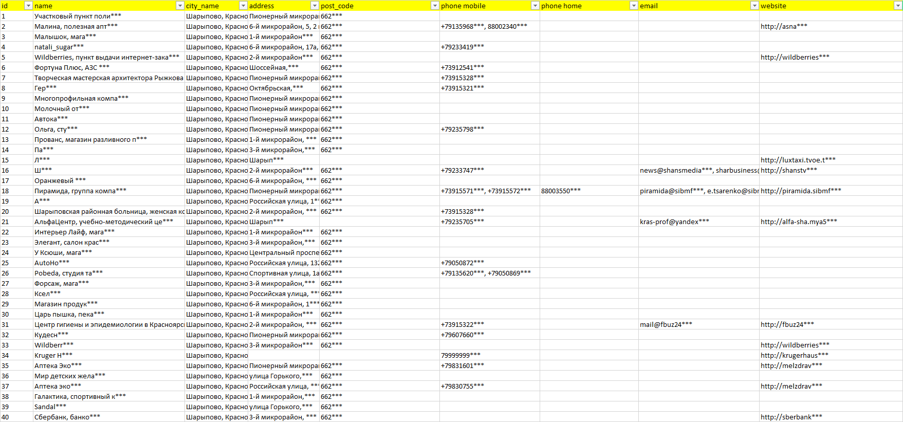 База организаций Шарыпово, вся Россия в формате Excel с эл. почтами, телефонами, сайтами, ссылками на соц сети, координатами и другой информацией. Скачайте демо версию, чтобы ознакомиться с данными.