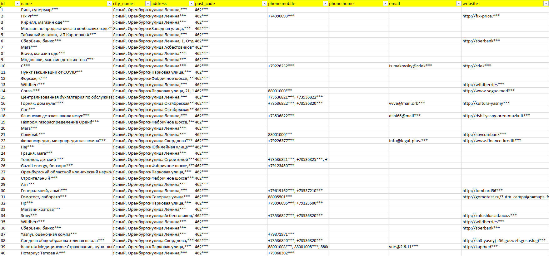 База организаций Ясный, вся Россия в формате Excel с эл. почтами, телефонами, сайтами, ссылками на соц сети, координатами и другой информацией. Скачайте демо версию, чтобы ознакомиться с данными.