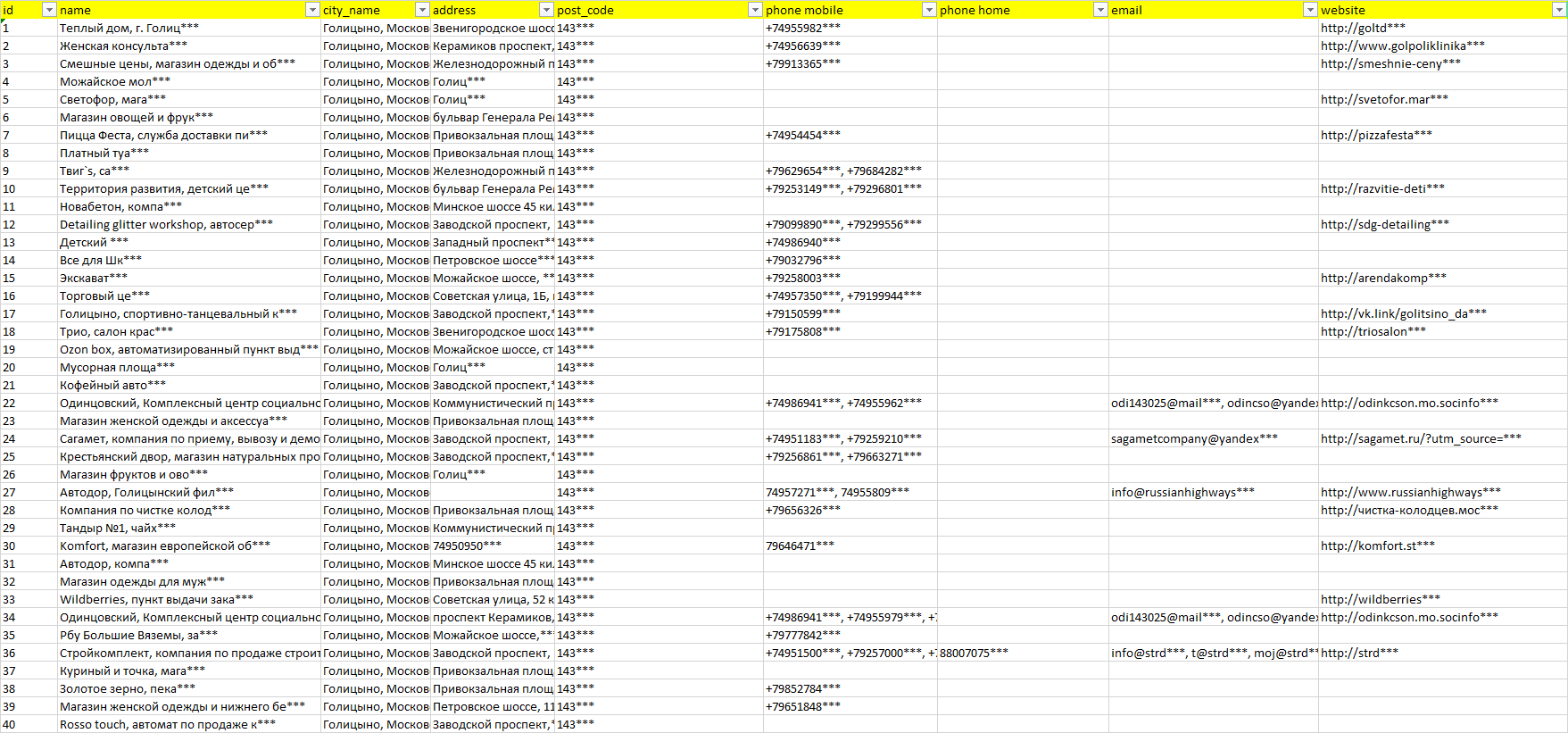 База компаний Голицыно, вся РФ в формате Excel с эл. почтами, телефонами, сайтами, ссылками на соц сети, координатами и другой информацией. Скачайте демо версию, чтобы ознакомиться с данными.