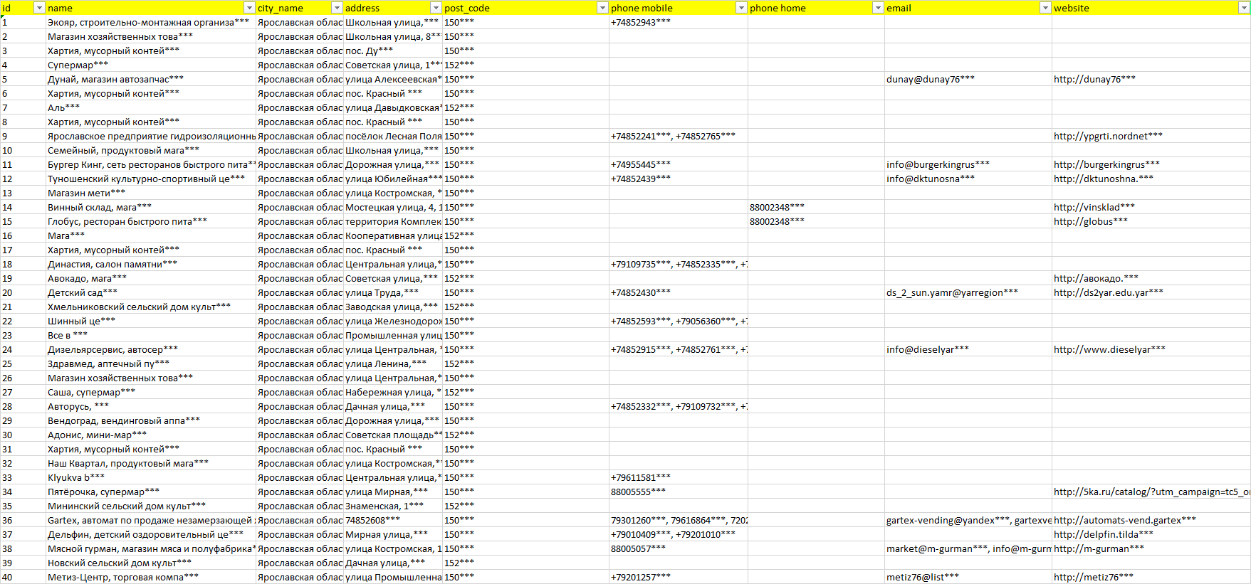 База организаций Ярославская область, вся Россия в формате Excel с эл. почтами, телефонами, сайтами, ссылками на соц сети, координатами и другой информацией. Скачайте демо версию, чтобы ознакомиться с данными.