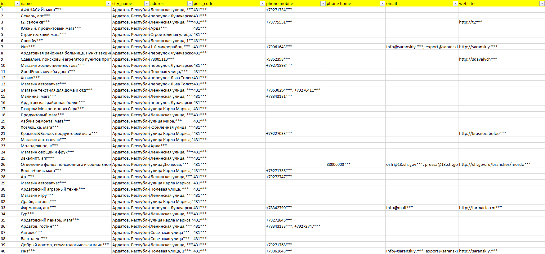 База организаций Ардатов, вся Россия в формате Excel с эл. почтами, телефонами, сайтами, ссылками на соц сети, координатами и другой информацией. Скачайте демо версию, чтобы ознакомиться с данными.