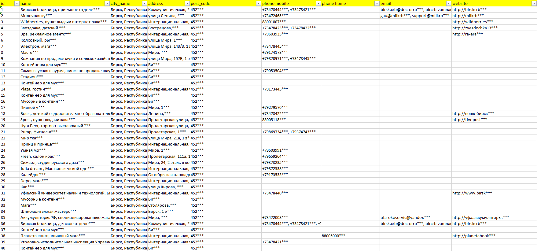 База компаний Бирск, вся РФ в формате Excel с эл. почтами, телефонами, сайтами, ссылками на соц сети, координатами и другой информацией. Скачайте демо версию, чтобы ознакомиться с данными.