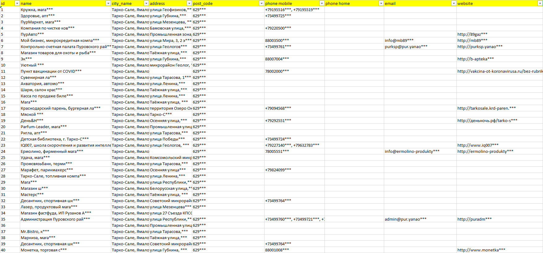 База компаний Тарко-Сале, вся РФ в формате Excel с эл. почтами, телефонами, сайтами, ссылками на соц сети, координатами и другой информацией. Скачайте демо версию, чтобы ознакомиться с данными.