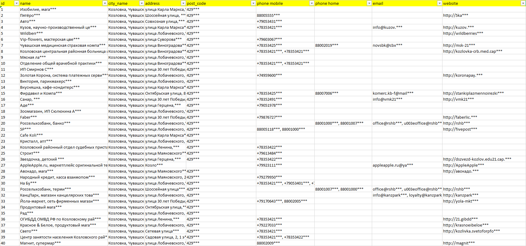 База организаций Козловка, вся Россия в формате Excel с эл. почтами, телефонами, сайтами, ссылками на соц сети, координатами и другой информацией. Скачайте демо версию, чтобы ознакомиться с данными.