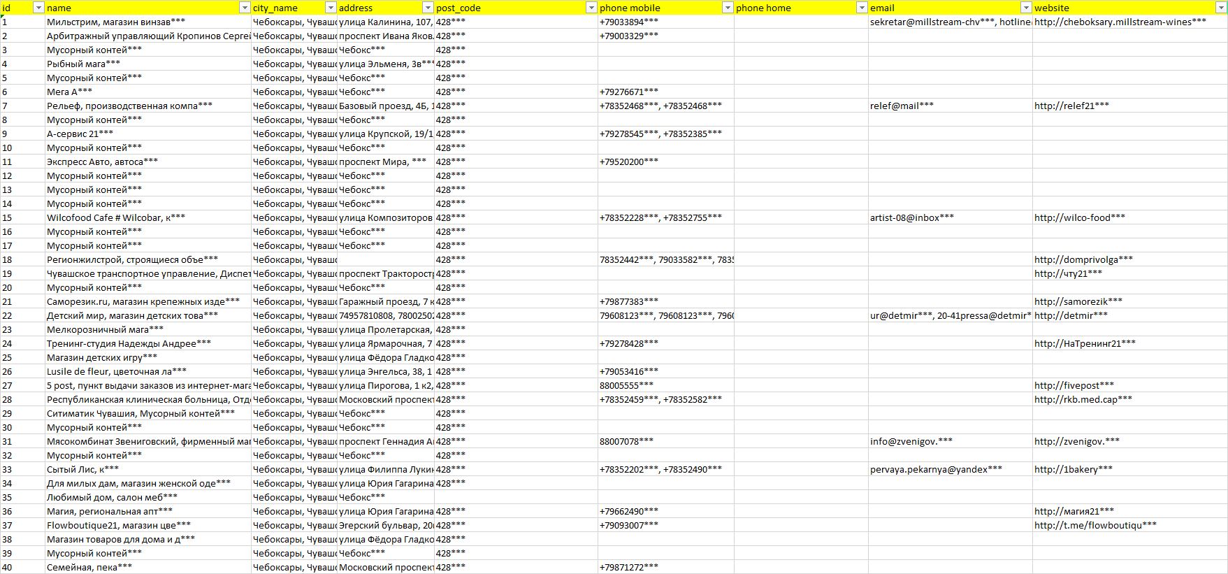 База компаний Чебоксары, вся РФ в формате Excel с эл. почтами, телефонами, сайтами, ссылками на соц сети, координатами и другой информацией. Скачайте демо версию, чтобы ознакомиться с данными.