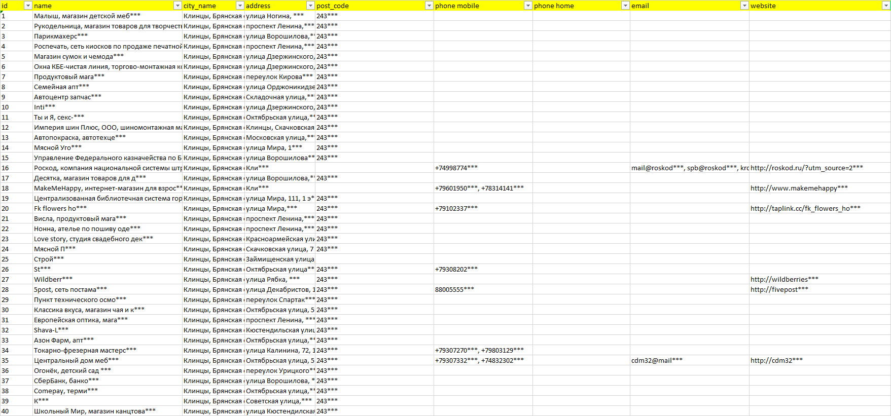 База компаний Клинцы, вся РФ в формате Excel с эл. почтами, телефонами, сайтами, ссылками на соц сети, координатами и другой информацией. Скачайте демо версию, чтобы ознакомиться с данными.