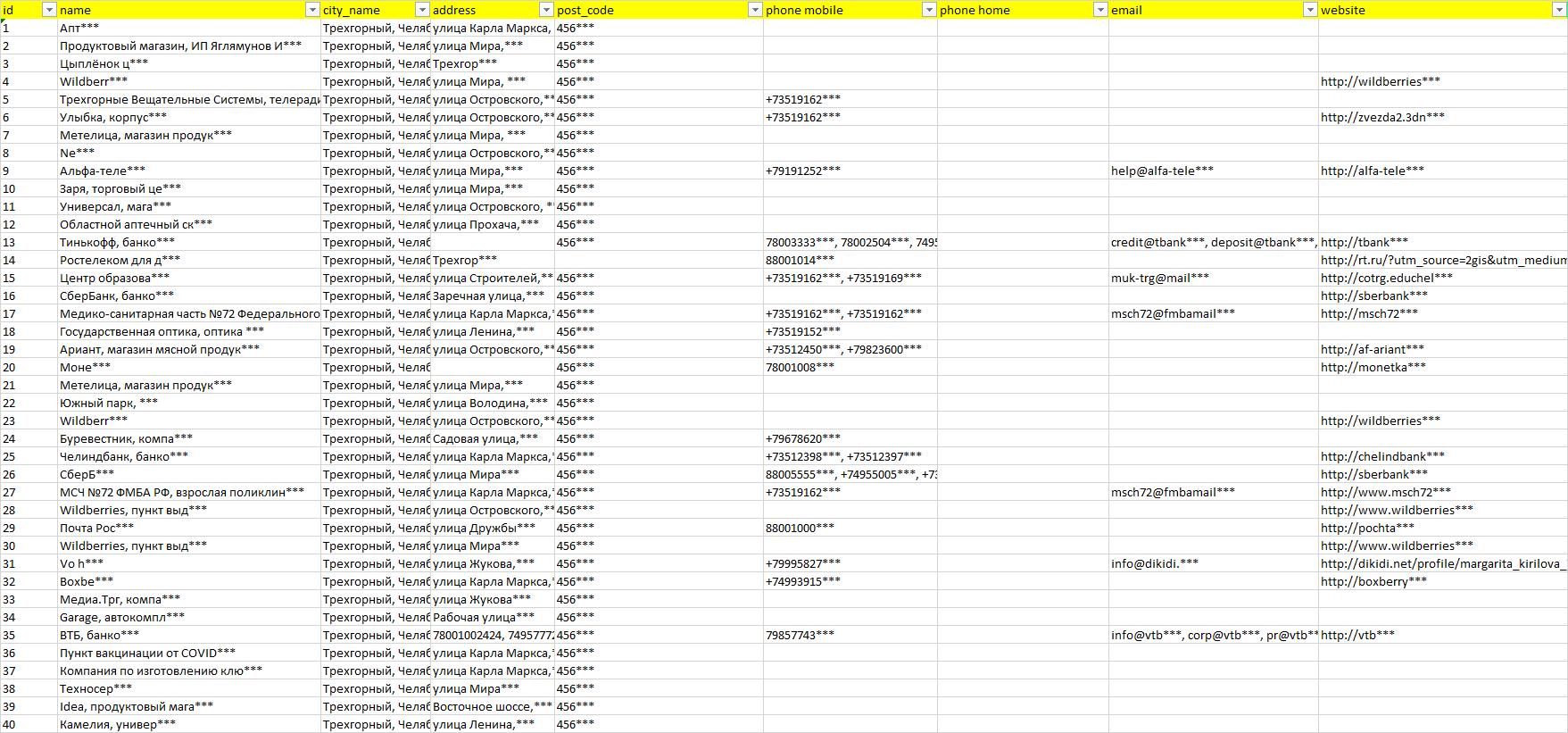 База организаций Трехгорный, вся Россия в формате Excel с эл. почтами, телефонами, сайтами, ссылками на соц сети, координатами и другой информацией. Скачайте демо версию, чтобы ознакомиться с данными.