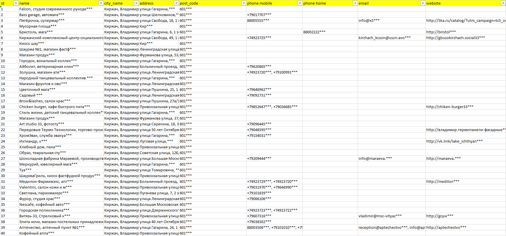 База организаций Киржач, вся Россия в формате Excel с эл. почтами, телефонами, сайтами, ссылками на соц сети, координатами и другой информацией. Скачайте демо версию, чтобы ознакомиться с данными.