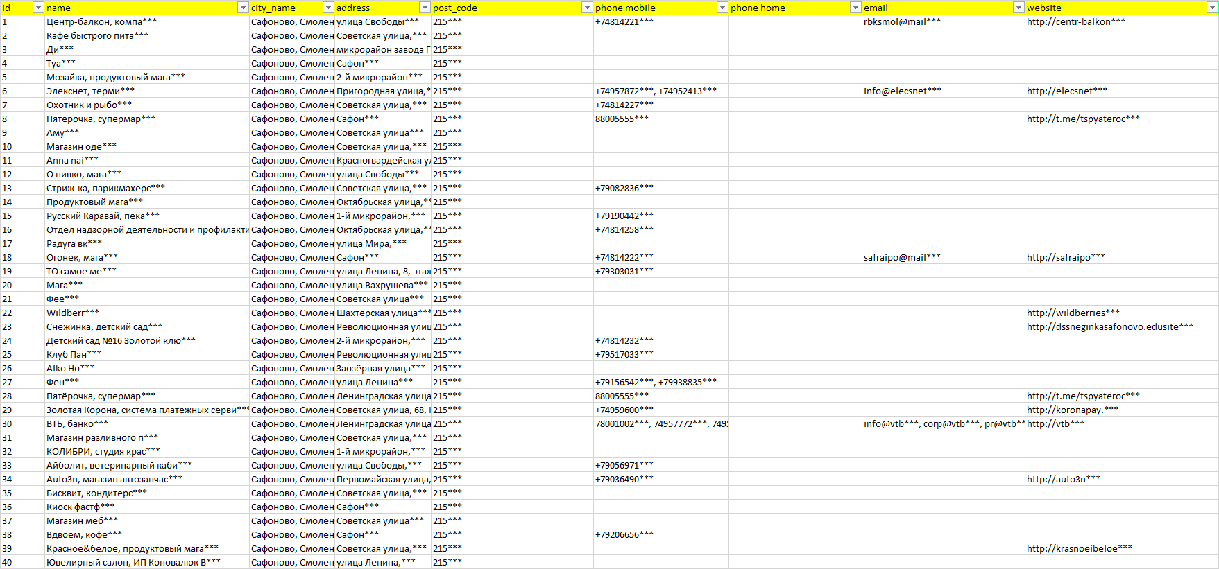 База компаний Сафоново, вся РФ в формате Excel с эл. почтами, телефонами, сайтами, ссылками на соц сети, координатами и другой информацией. Скачайте демо версию, чтобы ознакомиться с данными.