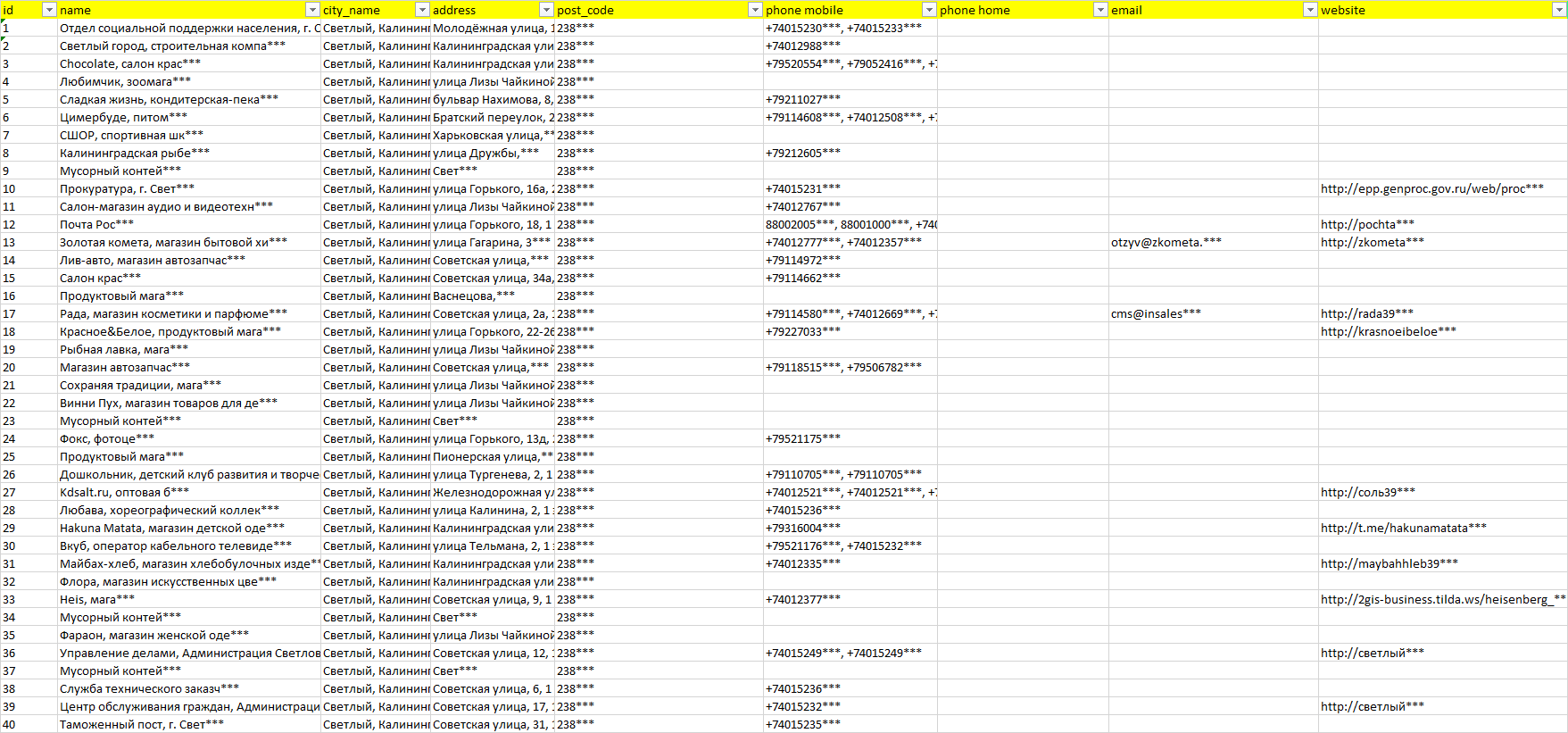 База организаций Светлый, вся Россия в формате Excel с эл. почтами, телефонами, сайтами, ссылками на соц сети, координатами и другой информацией. Скачайте демо версию, чтобы ознакомиться с данными.
