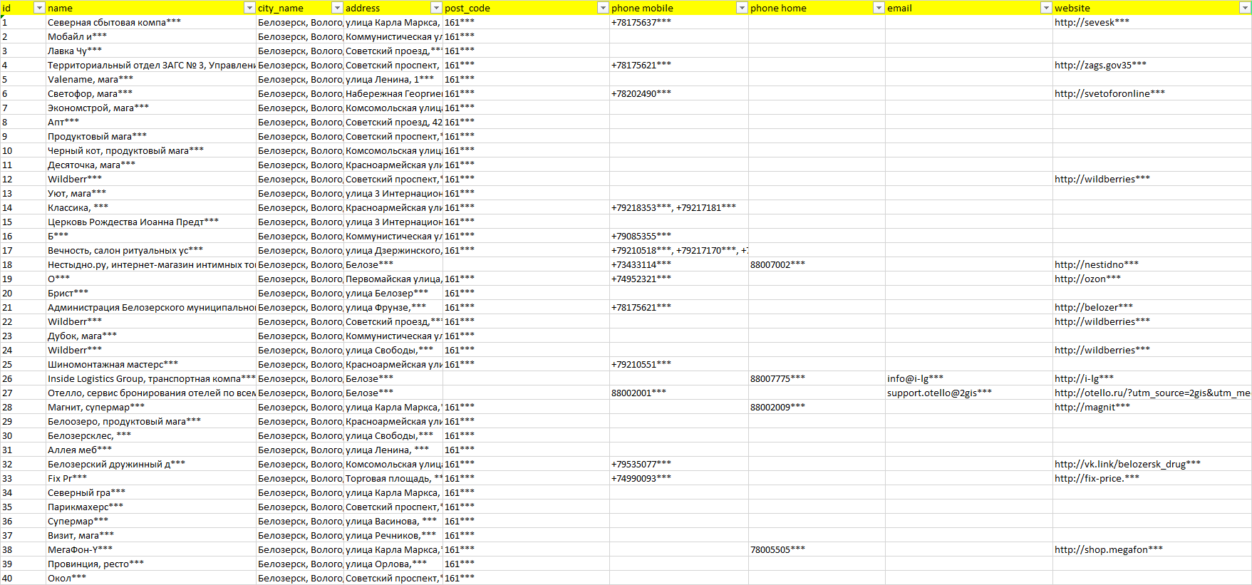 База организаций Белозерск, вся Россия в формате Excel с эл. почтами, телефонами, сайтами, ссылками на соц сети, координатами и другой информацией. Скачайте демо версию, чтобы ознакомиться с данными.