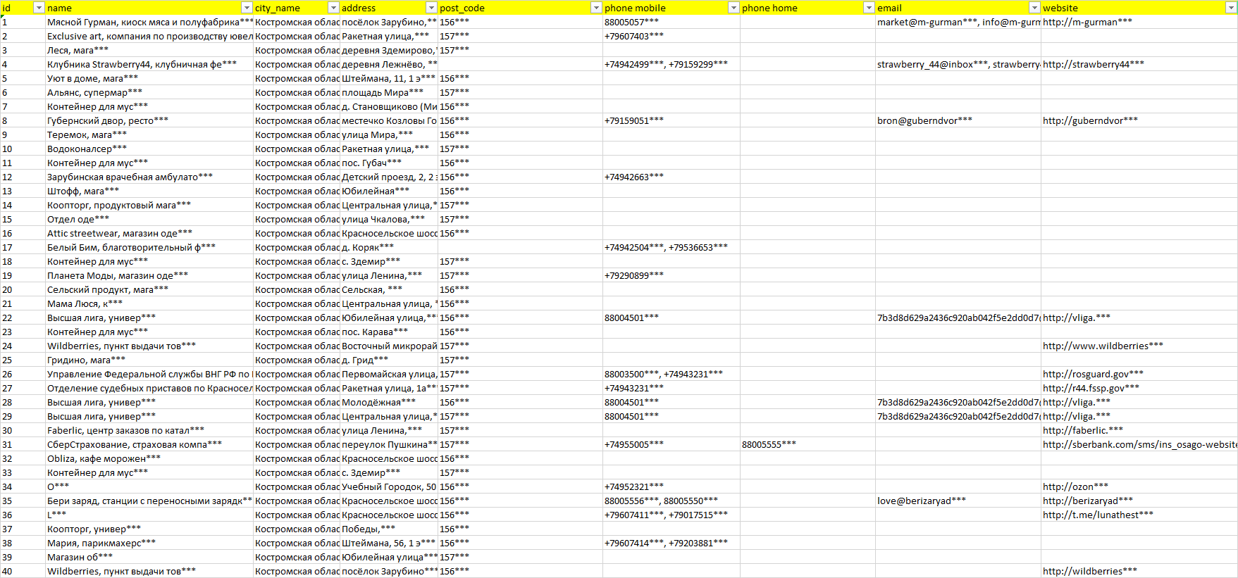 База организаций Костромская область, вся Россия в формате Excel с эл. почтами, телефонами, сайтами, ссылками на соц сети, координатами и другой информацией. Скачайте демо версию, чтобы ознакомиться с данными.