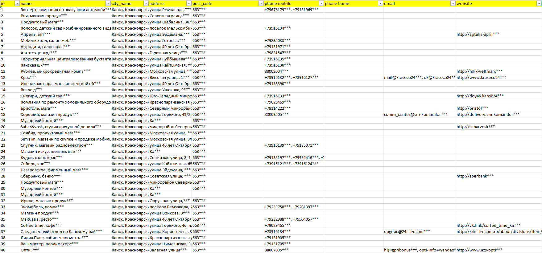 База компаний Канск, вся РФ в формате Excel с эл. почтами, телефонами, сайтами, ссылками на соц сети, координатами и другой информацией. Скачайте демо версию, чтобы ознакомиться с данными.