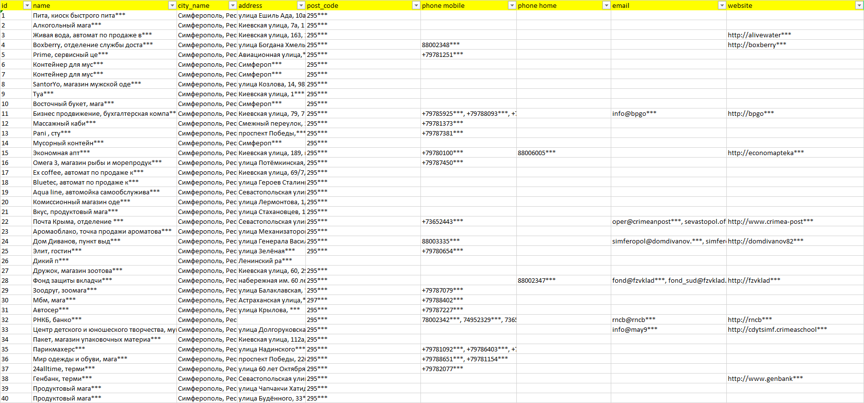 База организаций Симферополь, вся Россия в формате Excel с эл. почтами, телефонами, сайтами, ссылками на соц сети, координатами и другой информацией. Скачайте демо версию, чтобы ознакомиться с данными.