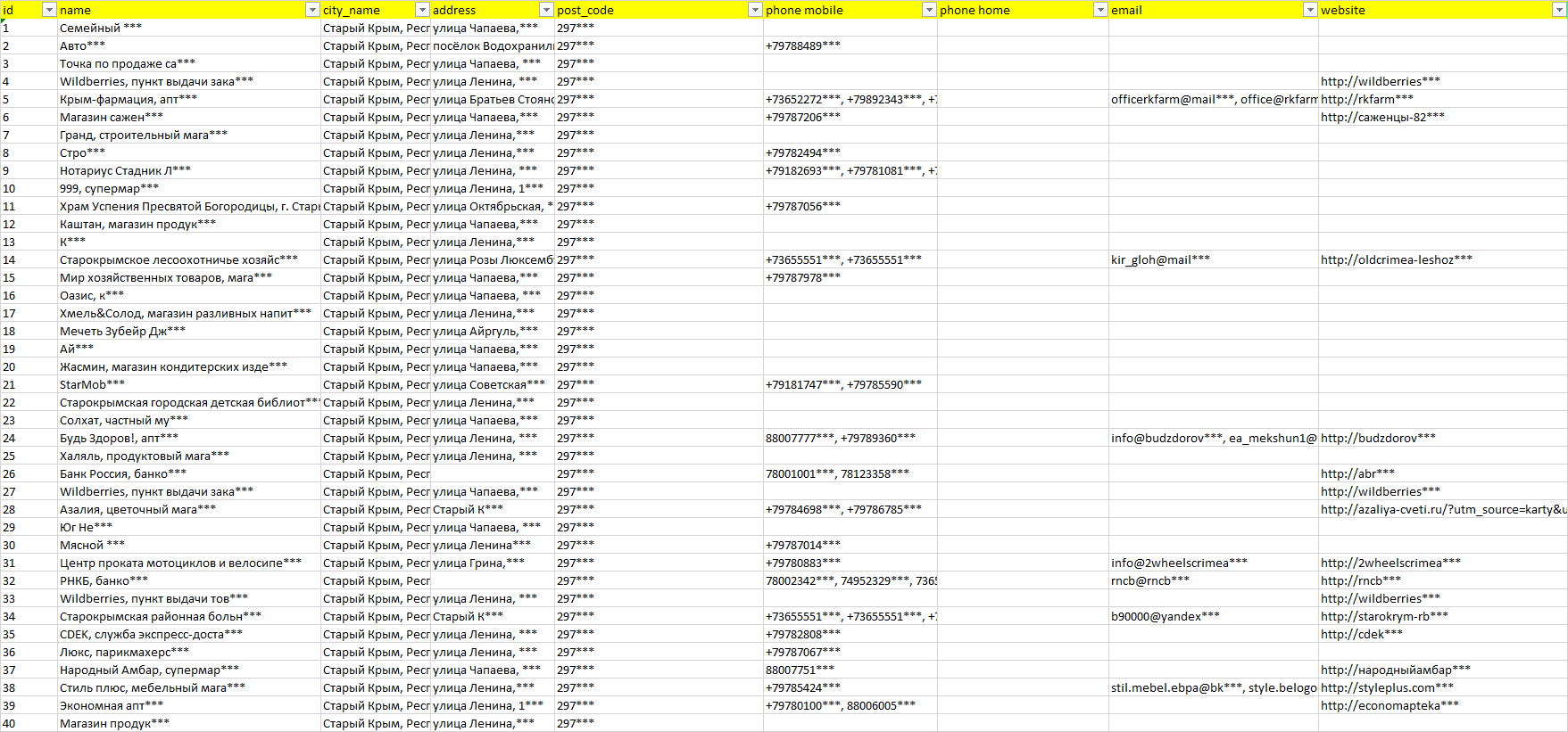 База организаций Старый Крым, вся Россия в формате Excel с эл. почтами, телефонами, сайтами, ссылками на соц сети, координатами и другой информацией. Скачайте демо версию, чтобы ознакомиться с данными.
