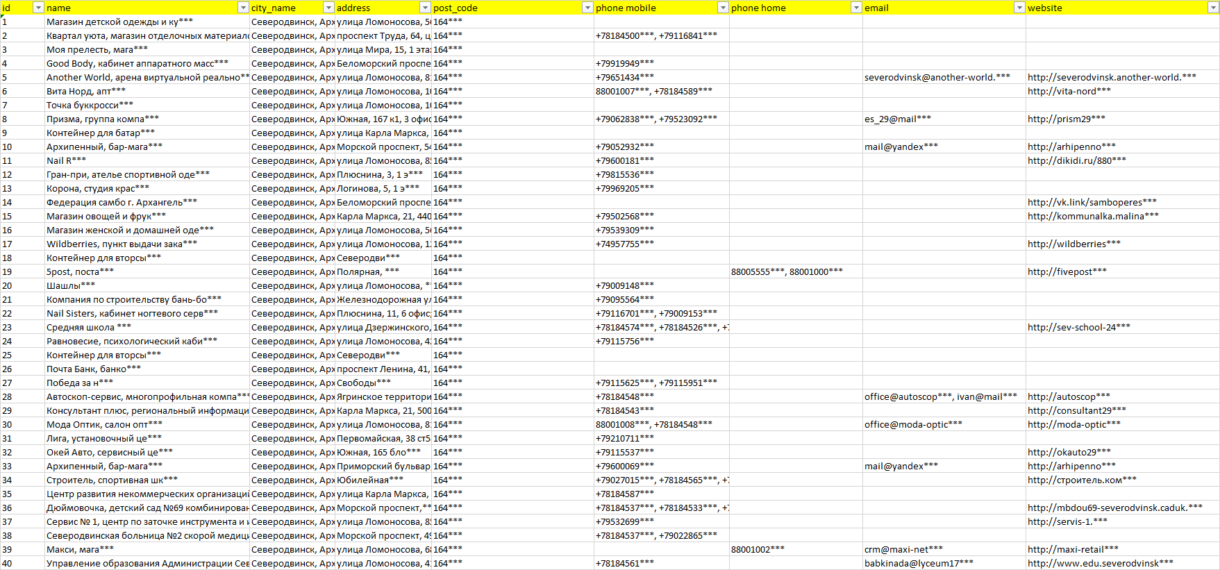 База компаний Северодвинск, вся РФ в формате Excel с эл. почтами, телефонами, сайтами, ссылками на соц сети, координатами и другой информацией. Скачайте демо версию, чтобы ознакомиться с данными.