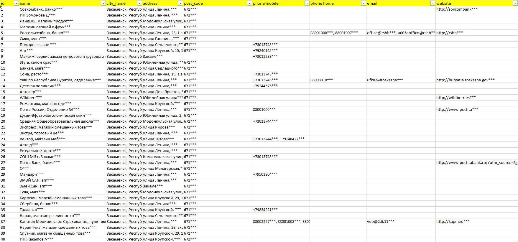 База организаций Закаменск, вся Россия в формате Excel с эл. почтами, телефонами, сайтами, ссылками на соц сети, координатами и другой информацией. Скачайте демо версию, чтобы ознакомиться с данными.