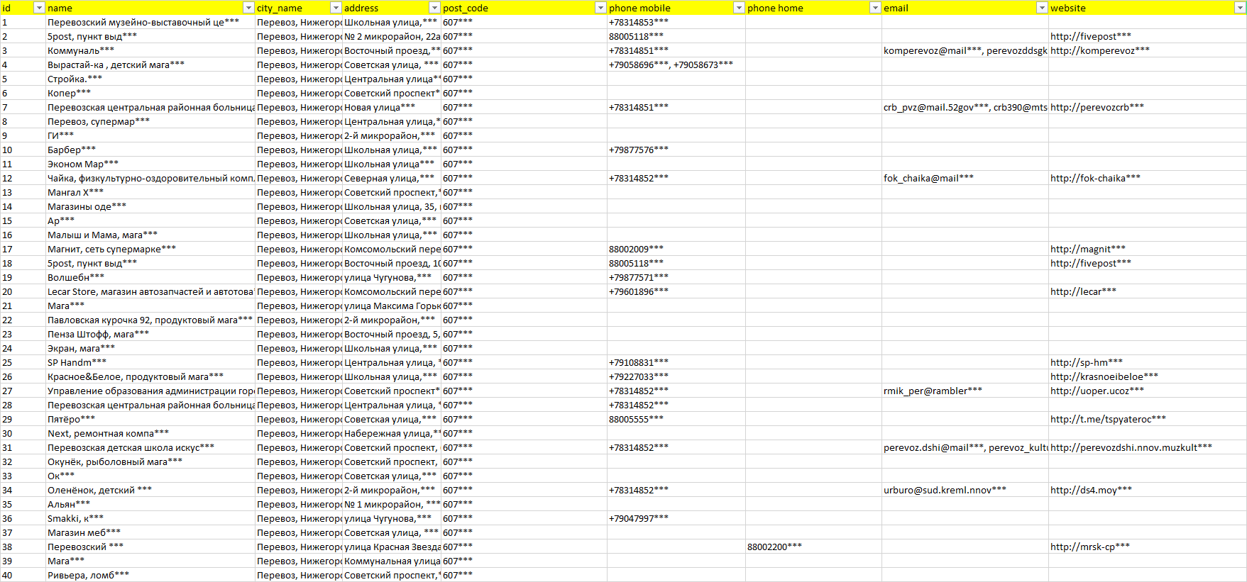 База компаний Перевоз, вся РФ в формате Excel с эл. почтами, телефонами, сайтами, ссылками на соц сети, координатами и другой информацией. Скачайте демо версию, чтобы ознакомиться с данными.