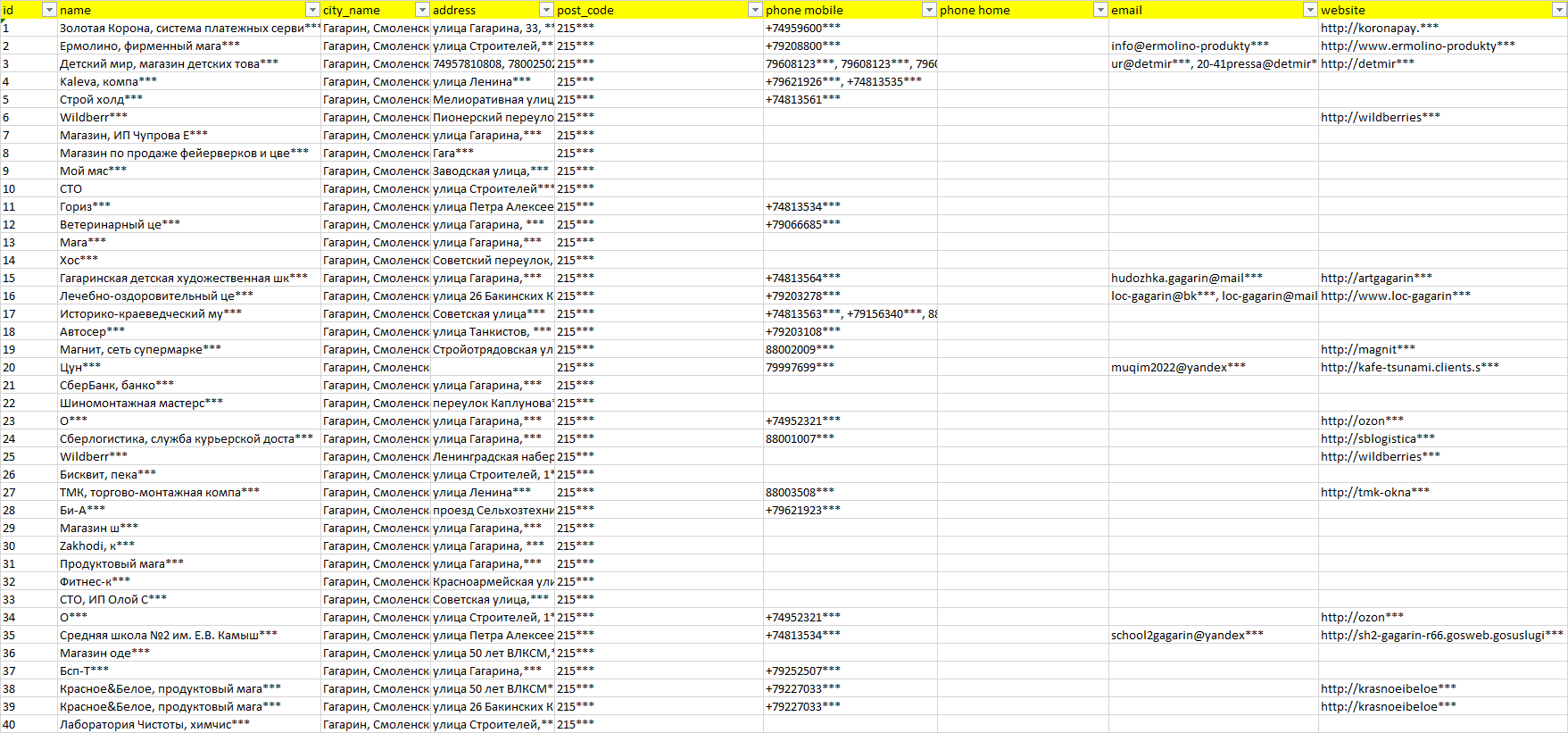 База компаний Гагарин, вся РФ в формате Excel с эл. почтами, телефонами, сайтами, ссылками на соц сети, координатами и другой информацией. Скачайте демо версию, чтобы ознакомиться с данными.
