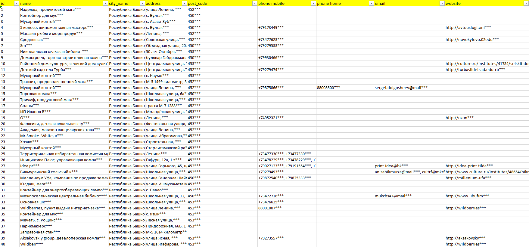 База организаций Республика Башкортостан, вся Россия в формате Excel с эл. почтами, телефонами, сайтами, ссылками на соц сети, координатами и другой информацией. Скачайте демо версию, чтобы ознакомиться с данными.