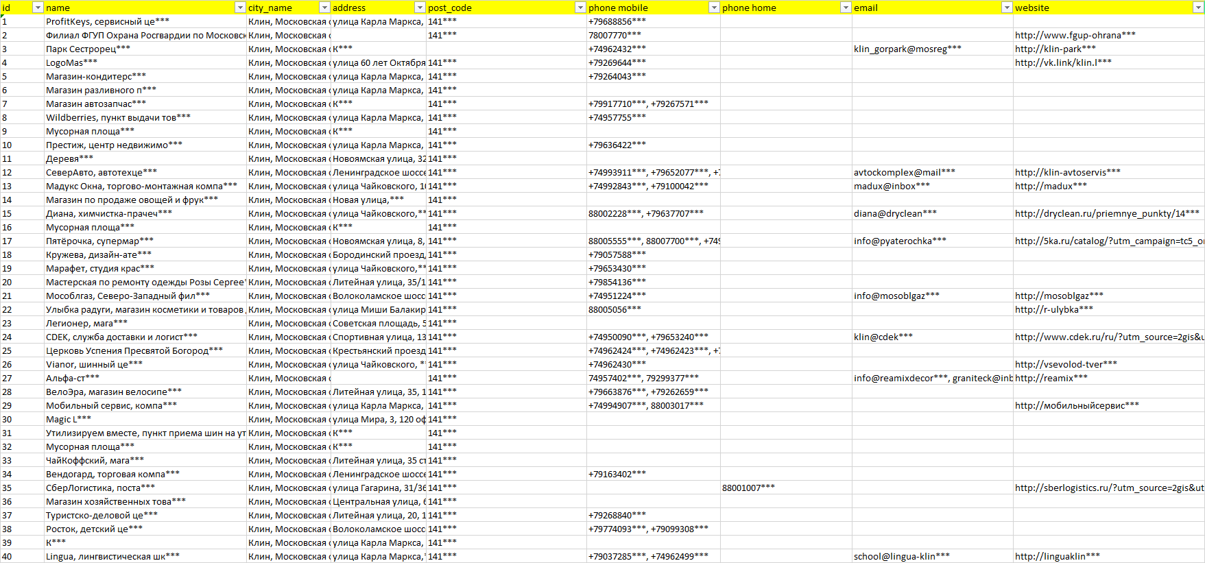 База компаний Клин, вся РФ в формате Excel с эл. почтами, телефонами, сайтами, ссылками на соц сети, координатами и другой информацией. Скачайте демо версию, чтобы ознакомиться с данными.