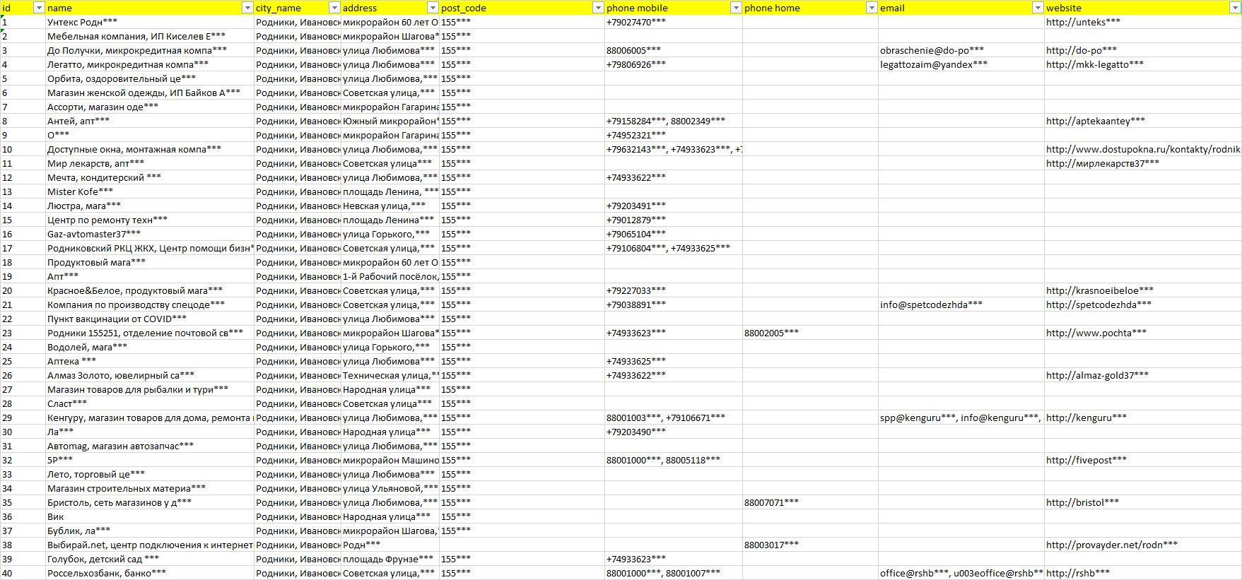 База организаций Родники, вся Россия в формате Excel с эл. почтами, телефонами, сайтами, ссылками на соц сети, координатами и другой информацией. Скачайте демо версию, чтобы ознакомиться с данными.
