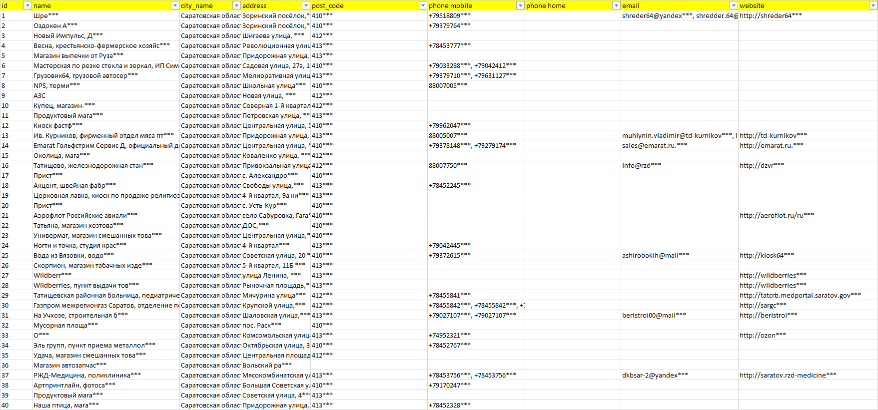 База компаний Саратовская область, вся РФ в формате Excel с эл. почтами, телефонами, сайтами, ссылками на соц сети, координатами и другой информацией. Скачайте демо версию, чтобы ознакомиться с данными.