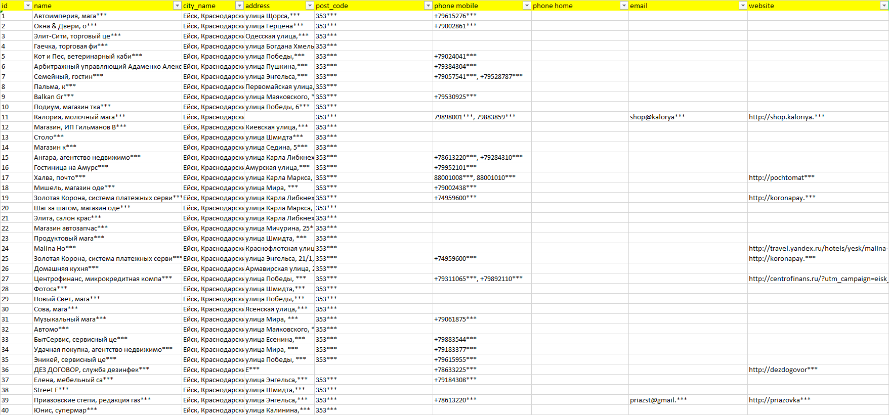 База организаций Ейск, вся Россия в формате Excel с эл. почтами, телефонами, сайтами, ссылками на соц сети, координатами и другой информацией. Скачайте демо версию, чтобы ознакомиться с данными.